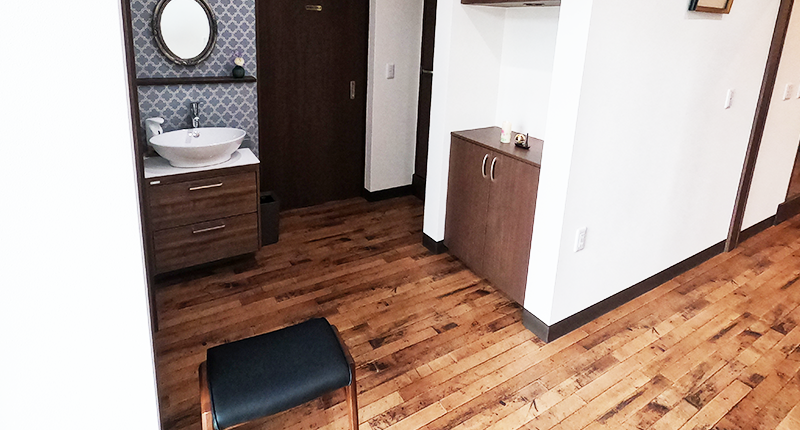 ホールとの段差をなくし、さりげなく飾られたお花で優しい空間となっております。まあるいお鈴を、ぜひ鳴らしてみてください。