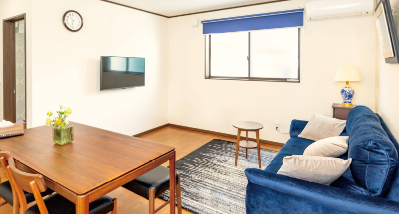 ブルーのソファと絵画でくつろぎの時間をお過ごしいただけます。広いダイニングテーブルで会食も可能です。