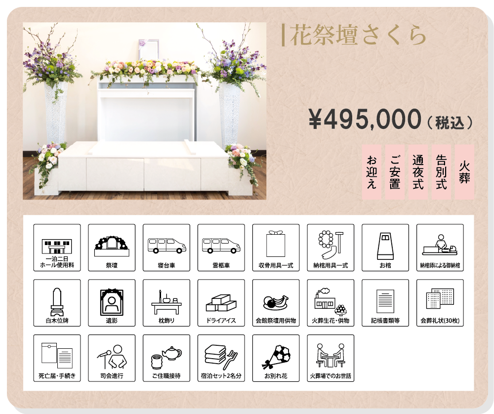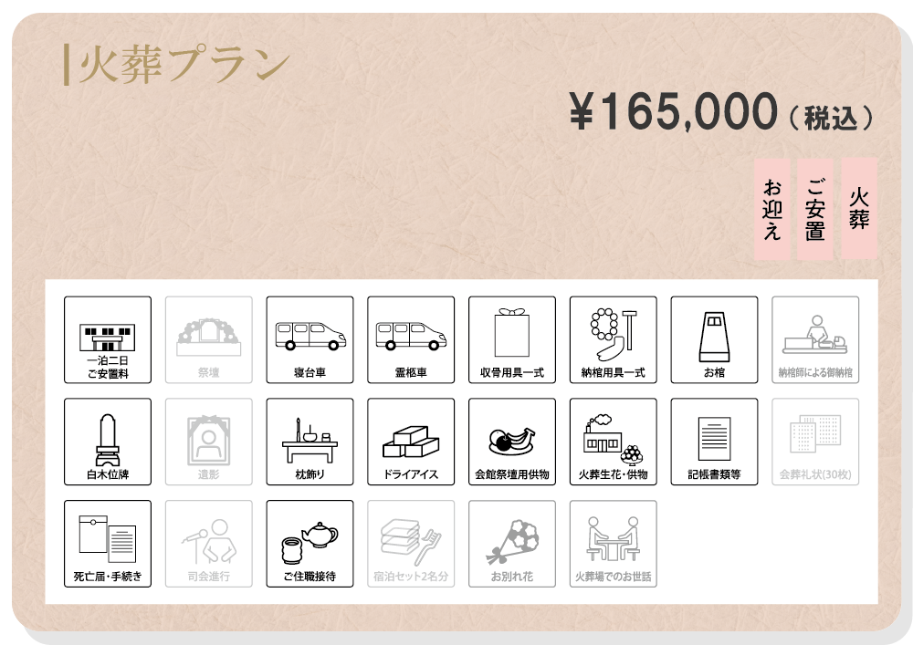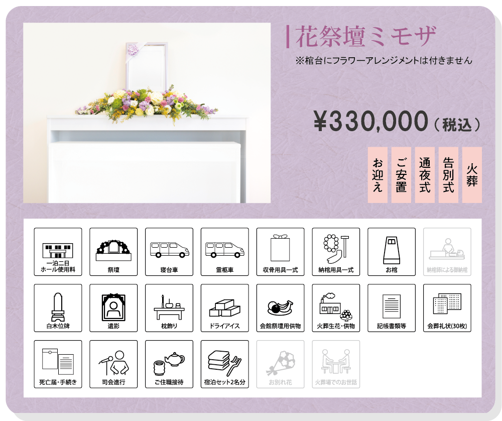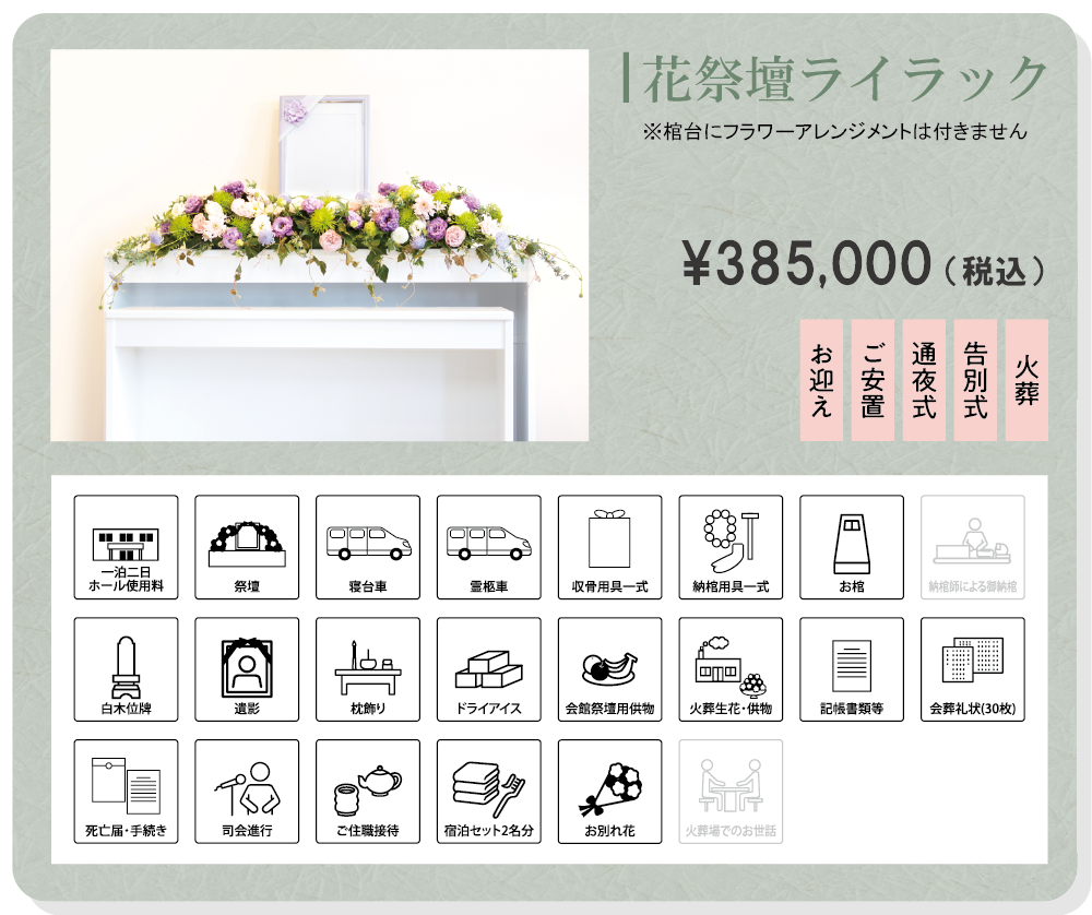※施主様のご意向や参列者の人数によって、必要性や数量が変わるものは別途費用となります。(お料理・引き物等)